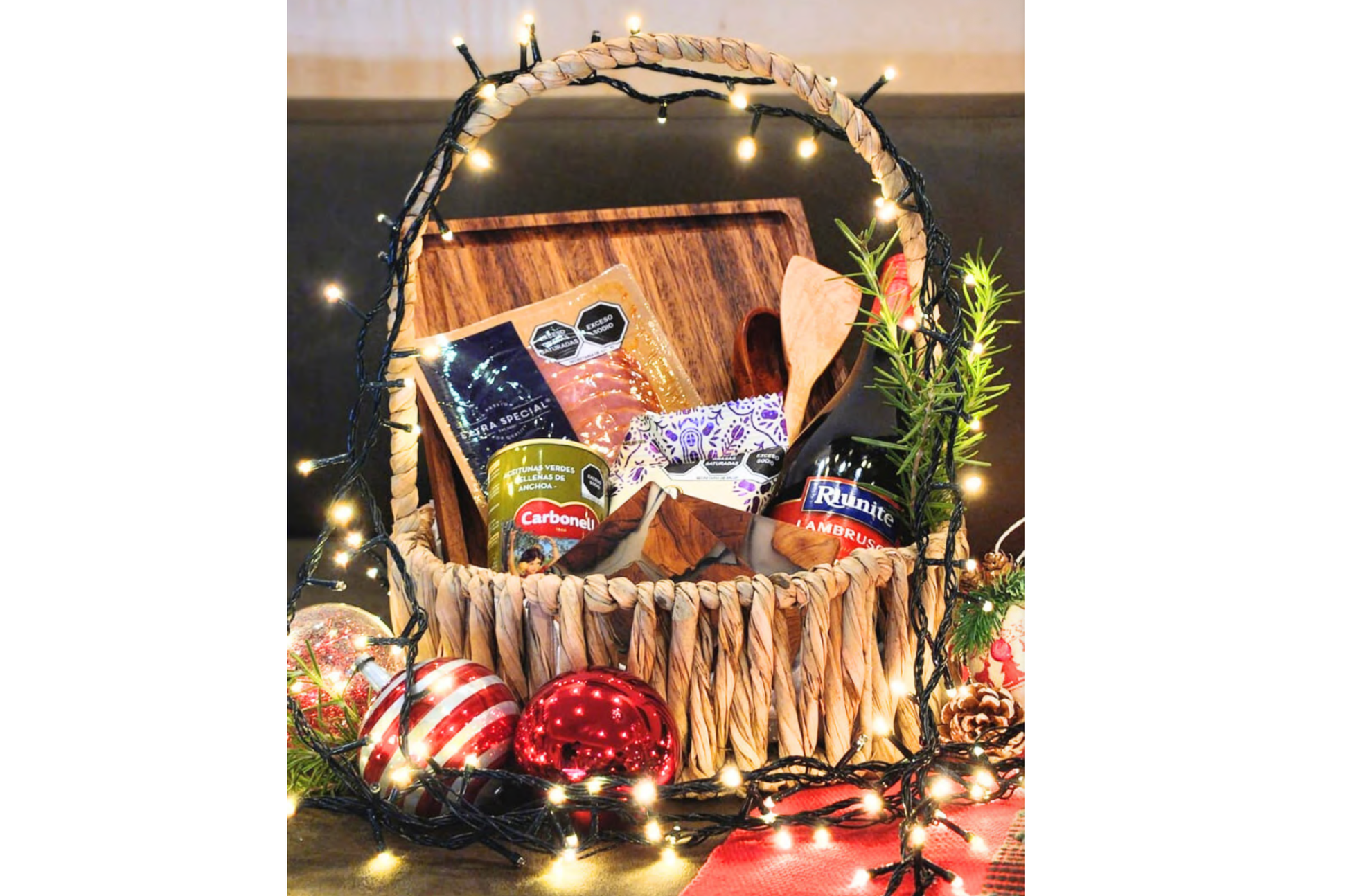 Canasta tejida a mano con fibras naturales de Palma de Chuspata; cuidadosamente armada para regalar momentos especiales. Incluye una selección de productos como vino, ate, aceitunas y otros detalles pensados para compartir y disfrutar. 🎄🍷