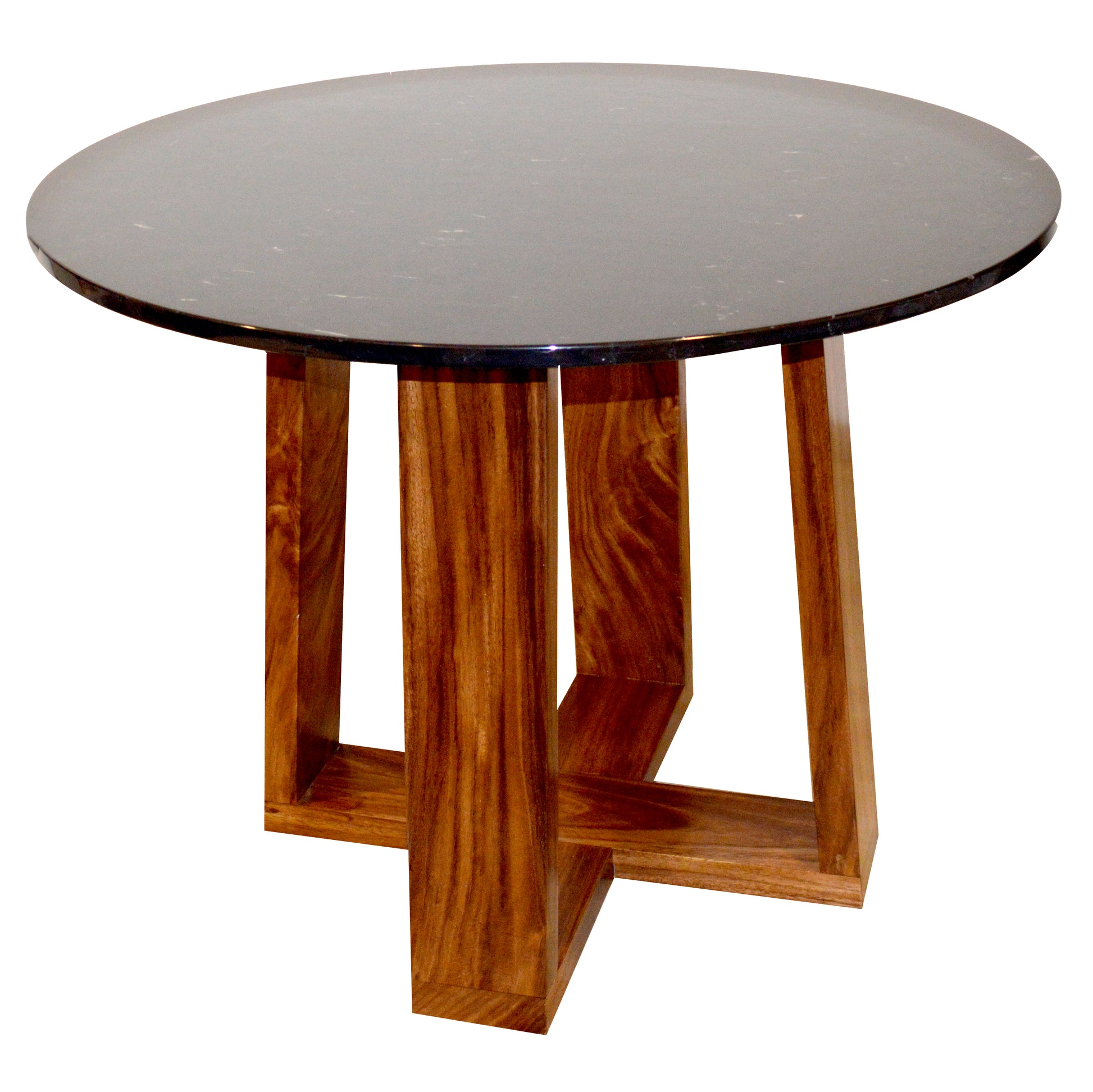 Dining room with circular black Monterrey marble cover; Parota wood cross base with matte natural wax finish with leveling glides.