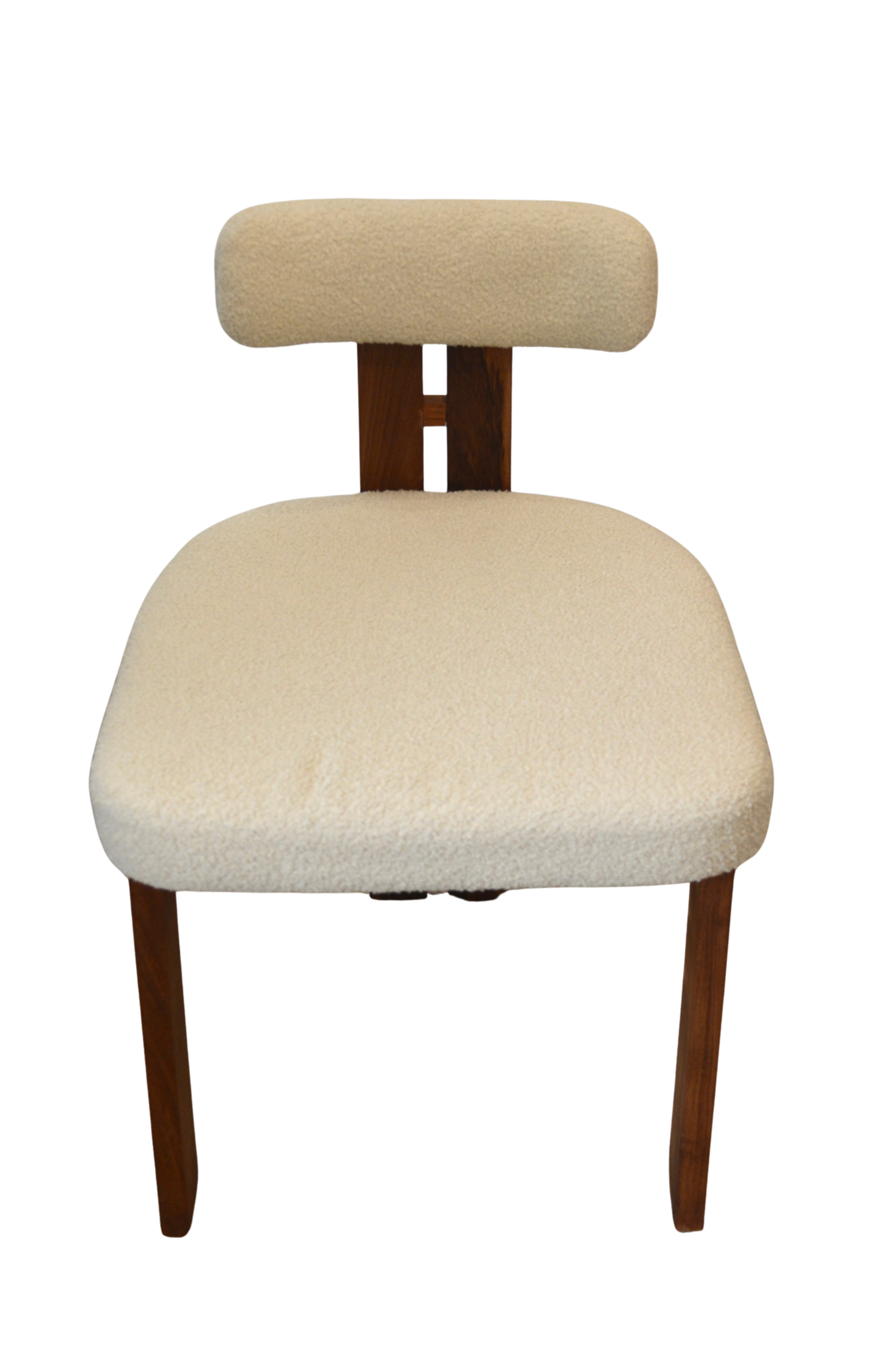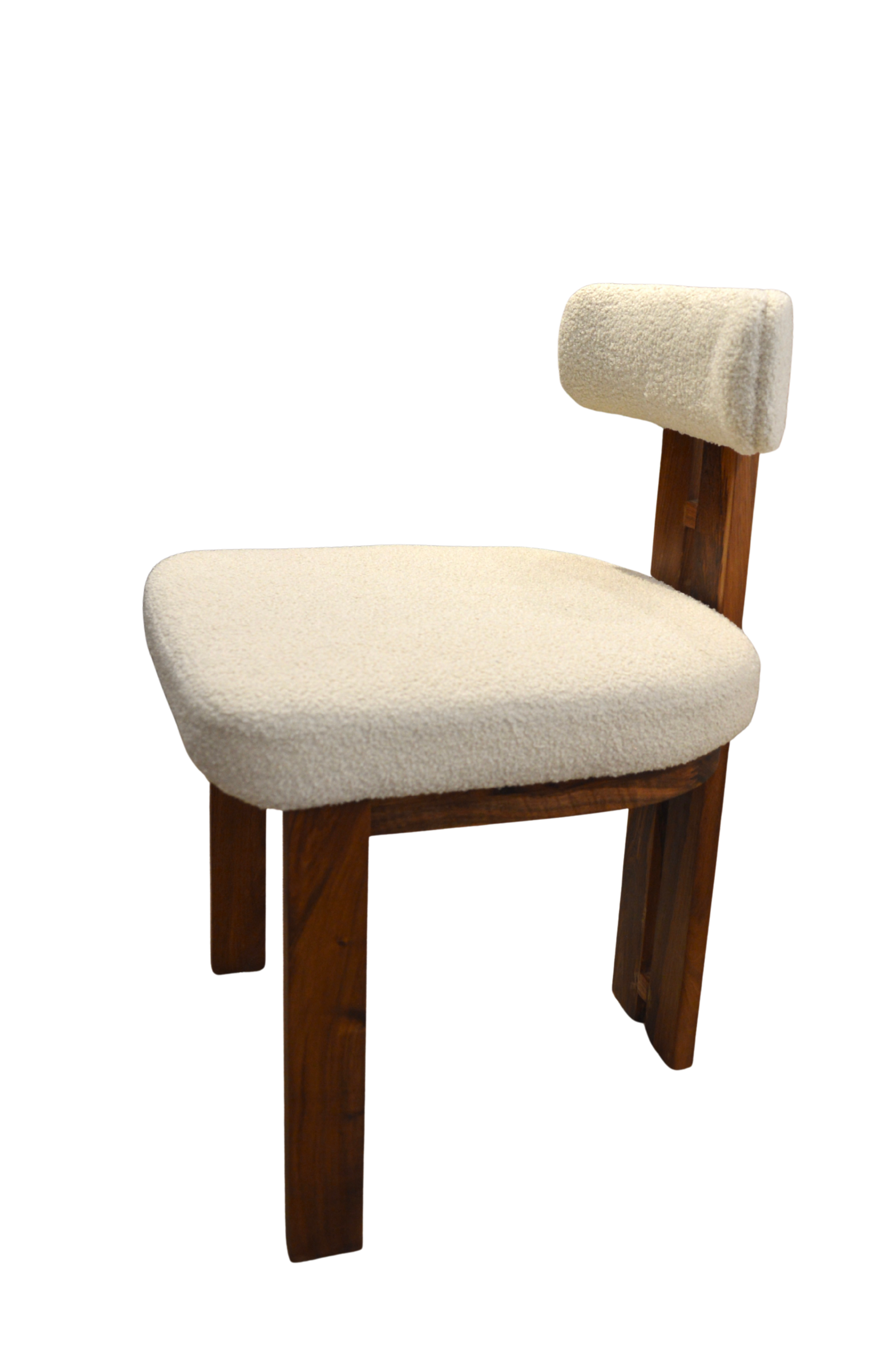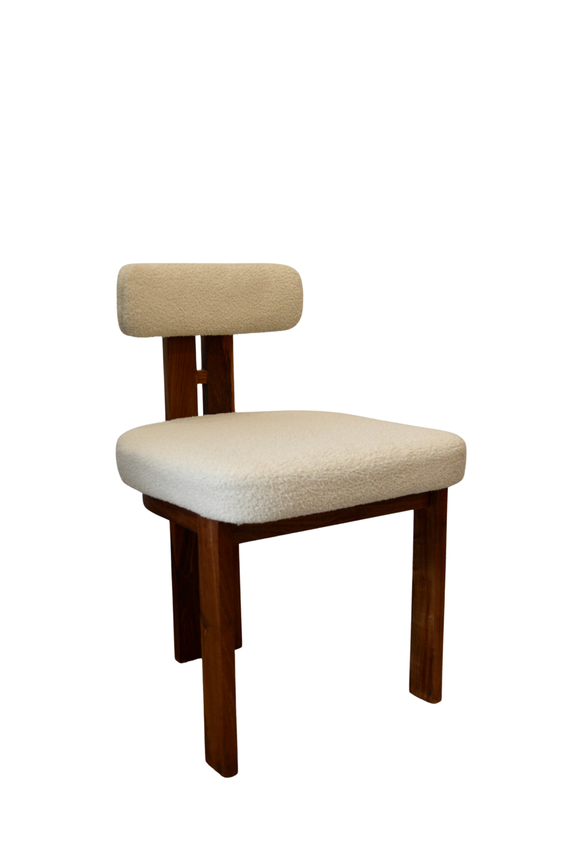 Silla elaborada en madera sólida de Tzalam, asiento y el respaldo están tapizados en bouclé de textura suave y esponjosa, con un acabado mullido que aporta confort y volumen.