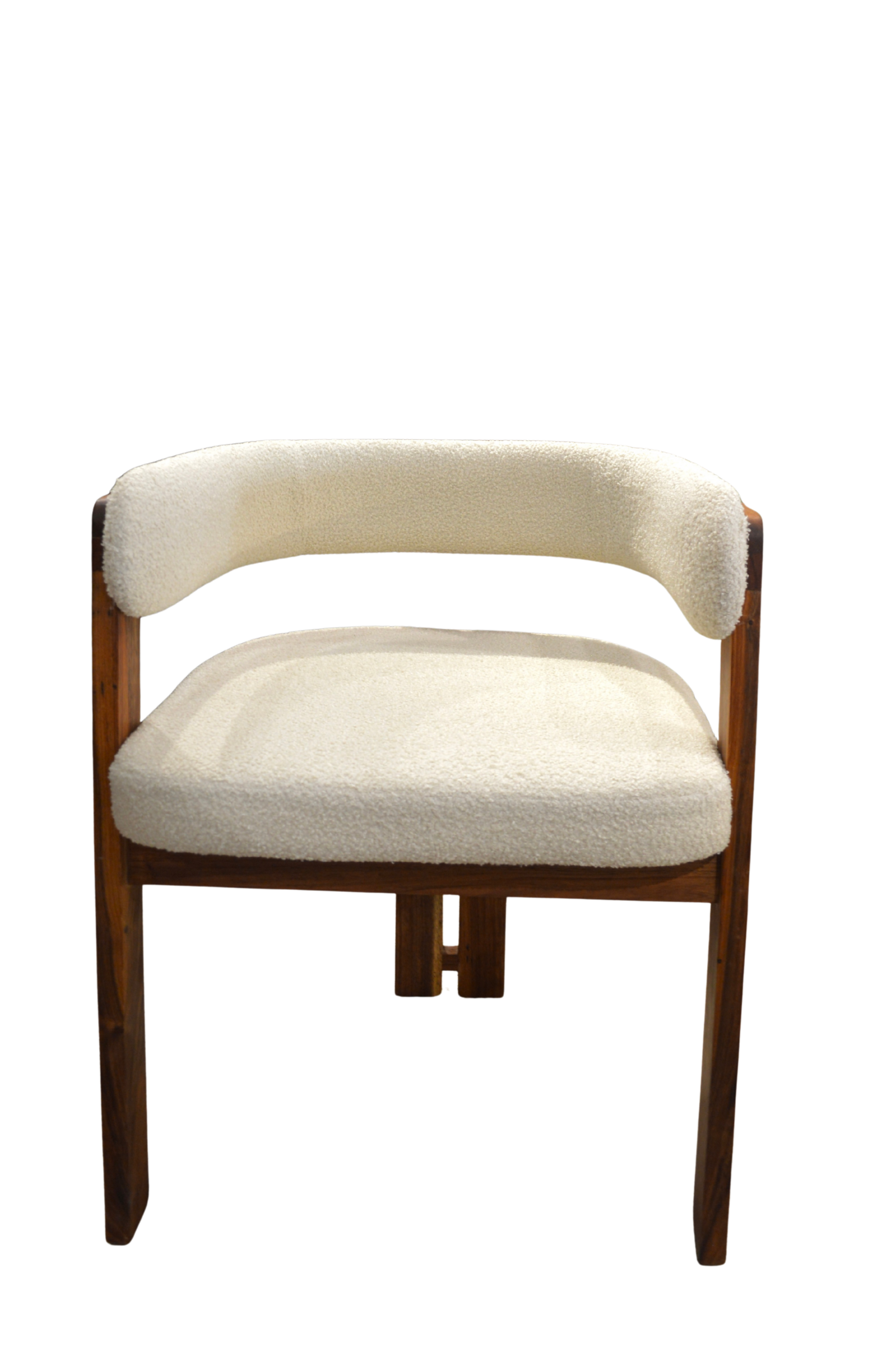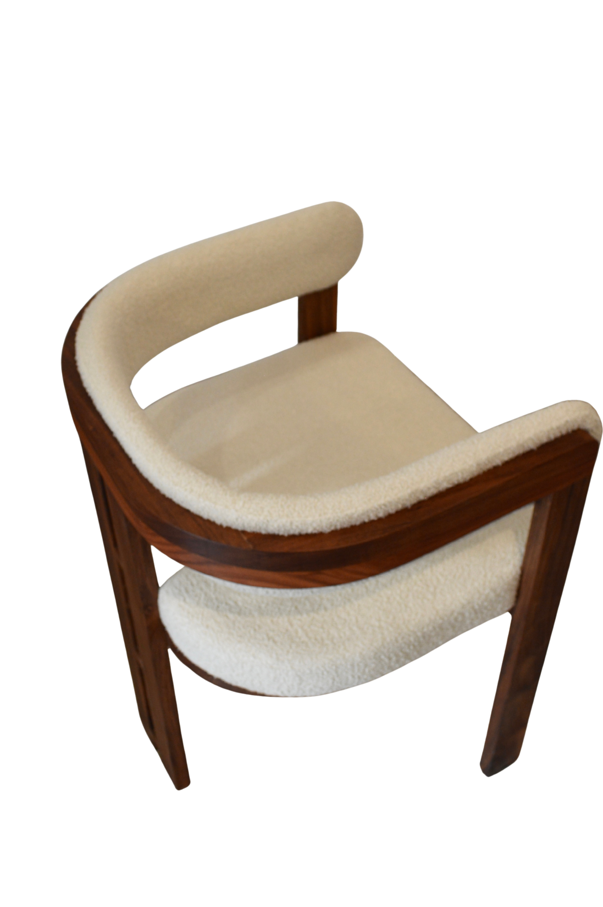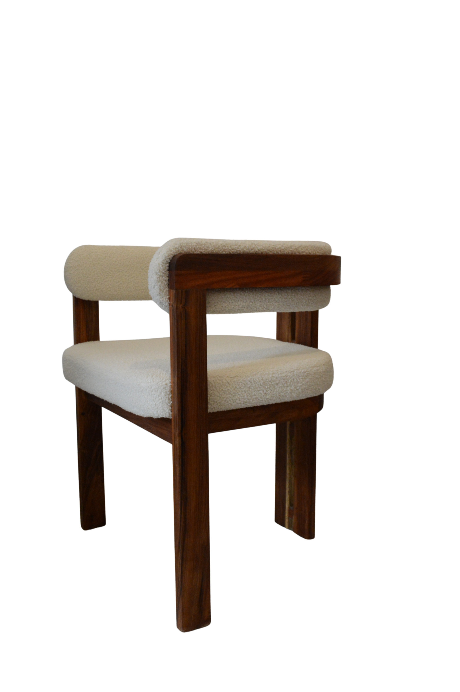 Silla elaborada en madera sólida de Tzalam, asiento y el respaldo están tapizados en bouclé de textura suave y esponjosa, con un acabado mullido que aporta confort y volumen.