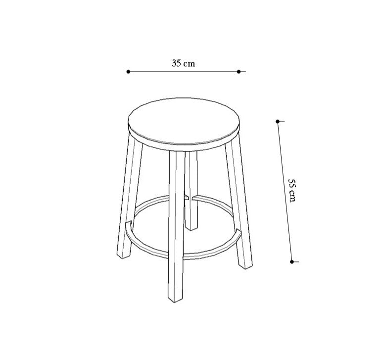 Banco elaborado con rodaja y base de madera de Parota acabado mate, unidas con un aro de solera en acero al carbono con pintura electrostática horneada negro mate; resbalones de felpa en la base.