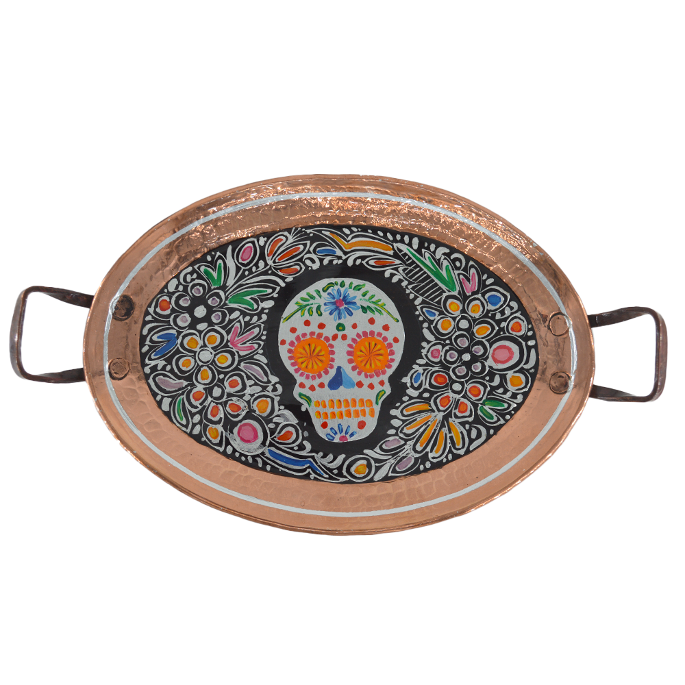 Charola artesanal, elaborada de cobre aplicando la técnica de patina y martillado y pintada a mano.