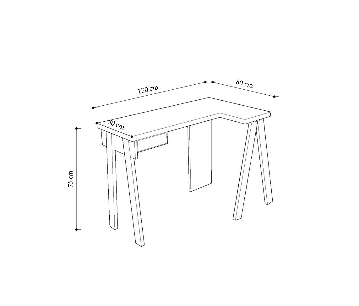 Escritorio en L, elaborado con cubierta en madera de parota, cajón con correderas telescópicas de cierre lento, acabado con sellador y poliuretano mate. Patas en diagonal de acero al carbono con pintura electroestática horneada negro mate, unidas al faldón de la cubierta con tornillos unión, con resbalones niveladores en las patas.