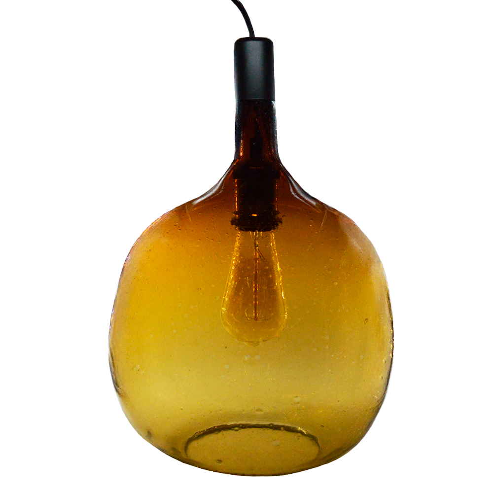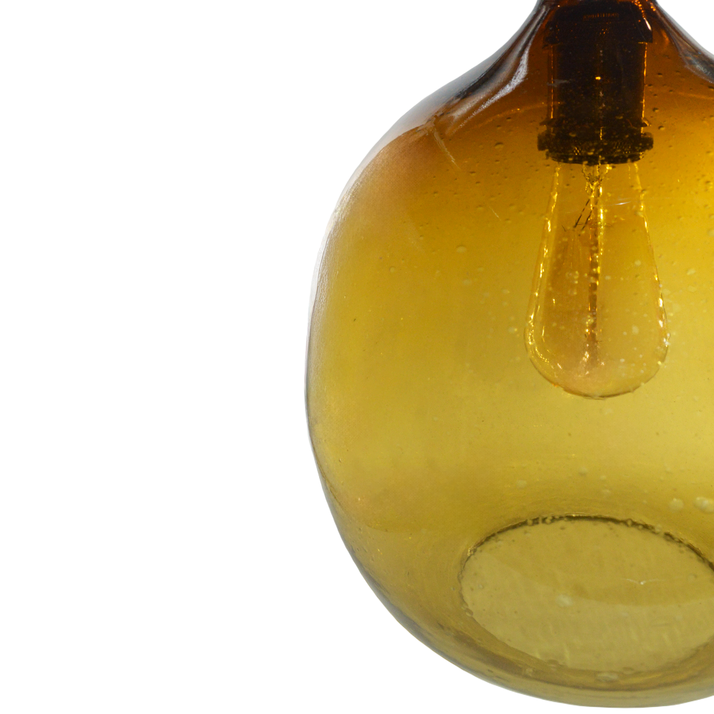 Lampara colgante artesanal con un diseño de bombilla, elaborado de vidrio soplado.